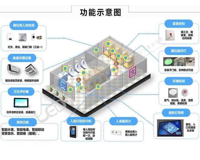 包含本地空廁位實時大屏顯示功能;廁所內(nèi)空位實時顯示功能(紅綠燈);微信查看場館的廁位使用情況;緊急求救 ;臭味探測器,可檢測衛(wèi)生間溫濕度、氨氣、硫化氫臭味值,如廁所內(nèi)異味達(dá)到 設(shè)定的濃度,系統(tǒng)可自動打開換氣設(shè)備進(jìn)行通風(fēng),以降低廁所內(nèi)的異味;智能照明,衛(wèi)生間可只設(shè)置1路照明長亮作為背景燈光,然后再分別在蹲坑或馬桶公共區(qū)、洗手區(qū)、 通道、小便區(qū)等經(jīng)常人流活動的地方安裝亮度紅外一體存在感應(yīng)器,可做到有人時照明 全亮、無人時除背景燈光外其他回路照明可自動延時熄滅;PC軟件集中查詢所有公廁的相關(guān)使用信息;滿員后鄰近公廁引導(dǎo);香煙煙霧檢測系統(tǒng);刷臉取紙機(jī);